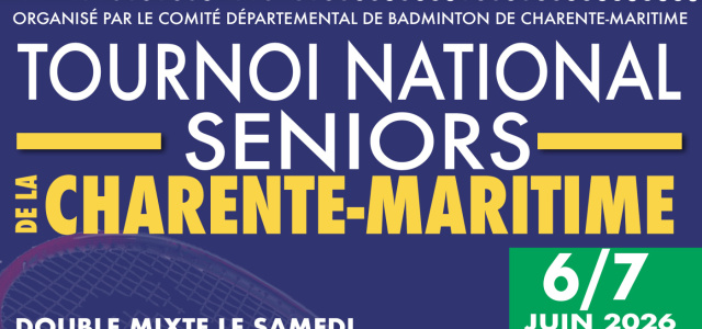 Le Comité Départemental de Badminton de Charente-Maritime est heureux de vous inviter à son tournoi national seniors, qui se déroulera les samedi 6 et dimanche 7 juin au complexe sportif de Sainte-Soulle. Pendant tout le week-end, le badminton sera à l’honneur sur 7 terrains, avec un programme sportif riche…